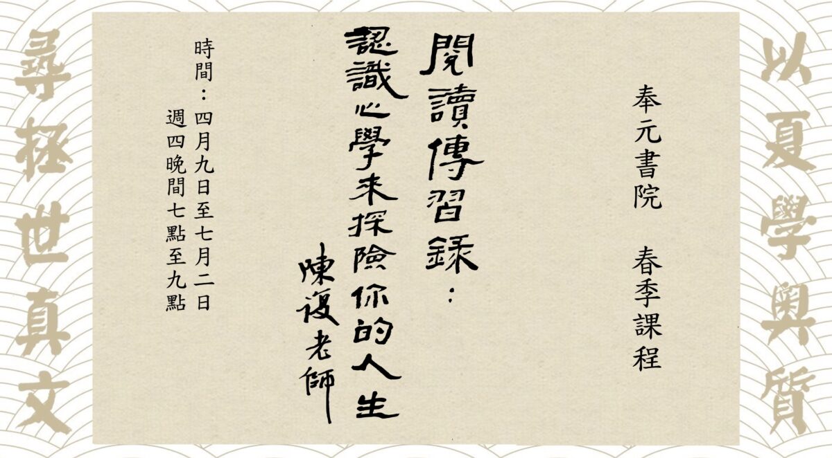 【講席】熊羿 老師 【講師簡介】 熊羿老師,中華奉元學會秘書長、果庭書院學會理事長。輔仁大學中文系 […]